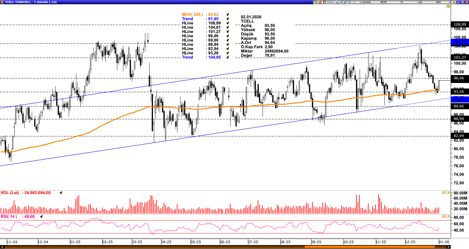 TCELL: Son süreçte ulaştığı yükselen kanal direncinden (104,95) realizasyon sürecine giren TCELL, ulaştığı 200 günlük ortalama (93,62) desteğinden güç bulmaktadır. Ortalama üzerinde fiyatlamaların devam etmesi, 96,46 ve 101,27 seviyelerine yönelik pozitif ivmenin sürmesini sağlayabilir. Olası baskılanmalarda 200 günlük ortalama (93,62) ve yükselen kanal desteği (91,45) güçlü destek bölgeleri olarak takip edilebilir.
