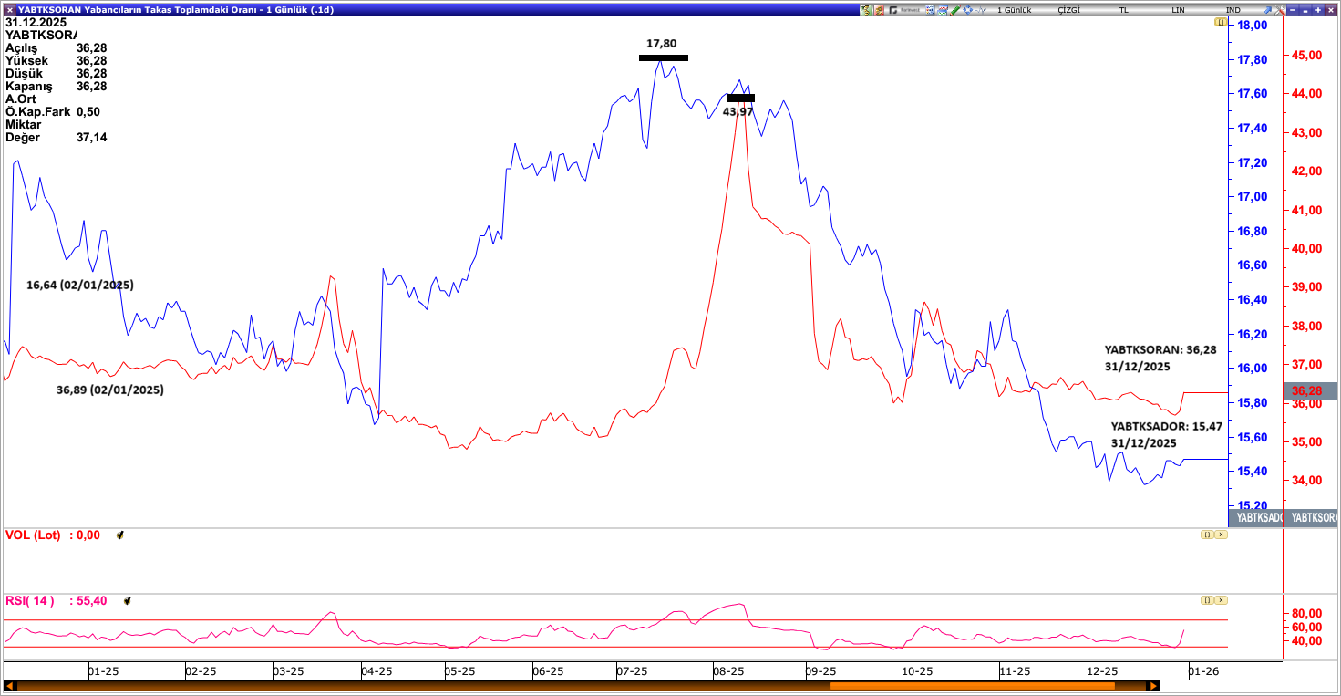 Aralık ayı itibarıyla yabancı takas oranı %36,28 seviyesinde bulunuyor. Seviye, yıl içindeki yüksek noktaların altında kalsa da Haziran 2023’te görülen dip seviyelerin üzerinde. Bu durum, yabancı ilgisinin tamamen zayıfladığı bir tabloya değil daha çok temkinli ve seçici bir duruşa işaret ediyor.