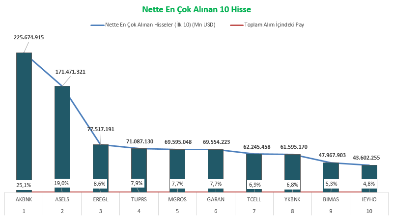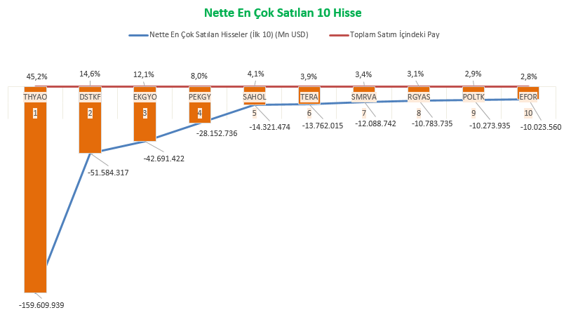 Borsa İstanbul verilerine göre, aralık ayında yabancı yatırımcılar en çok THY, Destek Finans Faktoring, Emlak Konut, Sabancı Holding ve Rönesans Gayrimenkul hisselerinde net satış yaptı; THY’de satışlar 159,6 milyon doları buldu. Politeknik Metal, Efor Yatırım, Türk Telekom, Halkbank ve Tatlıpınar Enerji de en çok işlem gören diğer hisseler arasında yer aldı.