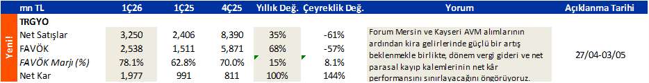 Torunlar GYO (OLUMLU; Öneri: Endeksin Üzerinde Getiri; 12 aylık Hedef Fiyat: 4,50 TL) 4Ç15'te 1,330 milyon TL net KAR açıkladı. Açıklanan net kar bizim beklentimiz olan 980 milyon TL net kar ve piyasa beklentisi olan 964 milyon TL net kardan iyi gerçekleşti. Ciro 4Ç15'te yıllık bazda %37 artarak 300 milyon TL2ye çıktı. Kira gelirlerinde yaşanan artışın sebebi Mall of Istanbul (MoI) ve Torun Tower ofis projelerinin kira gelirlerinin 2015'te tam yıl olarak görülmesinden kaynaklanmaktadır. Bilanço tarafında, Şirket'in 675 milyon dolar ve 196 milyon avro net açık pozisyonunu bulunmaktadır. Torunlar'ın devam eden 5. Levent adında konut projesinin beklentilerin üzerinde devam eden satış performansı (743 milyon TL ön satış geliri) elde etmiştir.