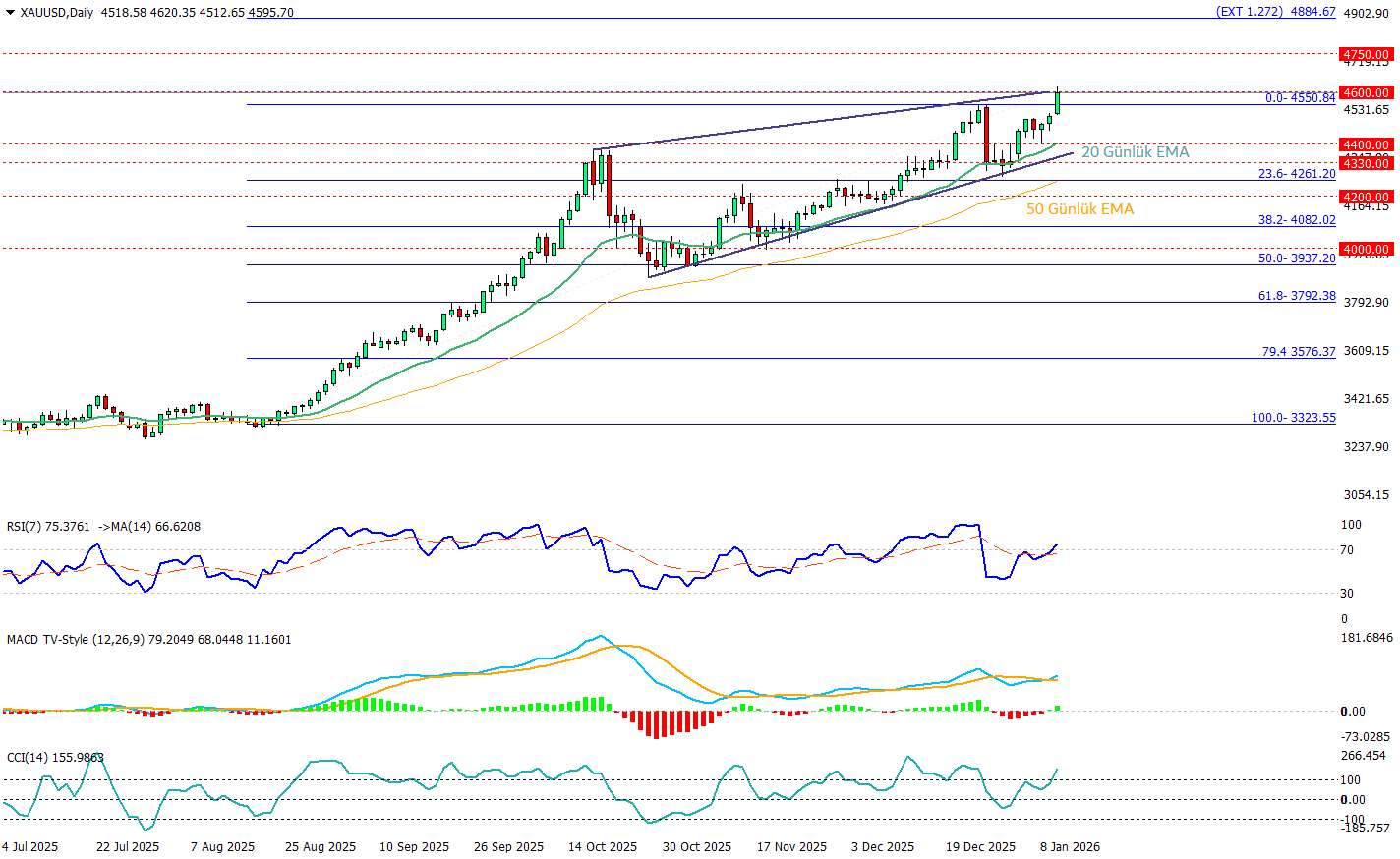 Ons altında günlük grafikte yükseliş trendi korunurken fiyatın 4550 bandını aştıktan sonra tarihi zirve olarak 4620 $’ı gördü ve şuan 4600 üzerinde tutunmaya çalışıyor. Bu bölge aynı zamanda önceki direnç hattının kırıldığı alan olduğundan, yukarı yönlü devamlılık için kritik eşik konumunda.
