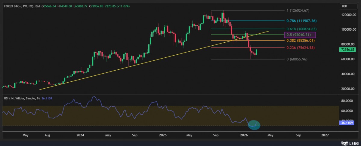 - Bu karmaşanın içerisinde kripto cenahının amiral gemisi Bitcoin uzun bir süredir âdeta ölü taklidi yapıp sessiz sedasız 66 bin dolar seviyeleri etrafında dolaşırken, dün aniden hayat belirtisi gösterip 74 bin dolar seviyesine kadar yükseldi. Dünkü hareket, açıkçası teknik mânâda takip ettiğimiz aşağı yönlü formasyonun da bozulmasına neden oldu. ABD Başkanı Trump, kripto para piyasasına yönelik düzenlemelerin hızlandırılması çağrısında bulunurken, bankaları kripto düzenlemelerini geciktirmekle eleştirmesi ve dijital varlık piyasasını destekleyen yeni yasal çerçevenin geçirilmesini istemesi yatırımcı algısını olumlu etkilediğini düşünüyoruz. Bitcoin'de görülen yükseliş, piyasada hem regülasyon tarafında daha net bir çerçeve oluşabileceği beklentisini hem de risk iştahındaki kısmi toparlanmayı yansıtırken, uzun pozisyon almak adına haftalık kapanışı takip edeceğiz. Eğer hareket dead cat bounce (ölü kedi zıplaması) değilse, yukarıda 93-94 bin dolar hedefi ile (tepe ve dip seviyenin %50 düzelmesi) uzun pozisyon deneyeceğiz (bakınız grafik).